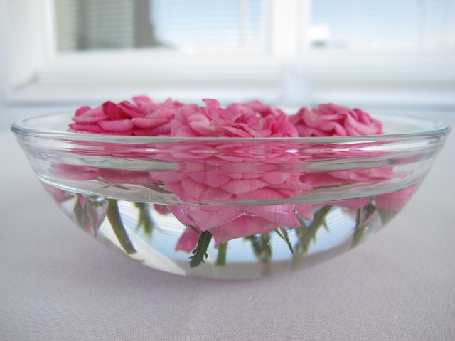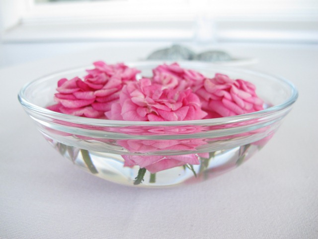 Rosor som inte längre riktigt platsar i blomrabatten med de nya starka knopparna kan ändå se riktigt snygga ut i en skål på bordet. Där är alla lika ljusrosa och svaga.