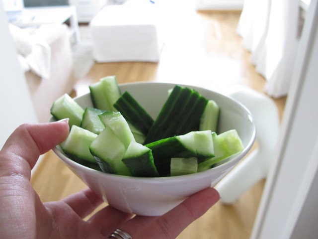 Okej, jag medger. Det har blivit ganska ohälsosamma mellanmål den här semestern. Sådär farligt ohälsosamt att det är riktigt nära att jeansen inte kommer att gå att knäppa när jag återgår till jobbet om ett par veckor. Därför är det väl bäst att ta tag i det hela och äta gurka. Gurkstavar (utan dipsås) är faktiskt ett favoritmellanmål just nu. Mmm.