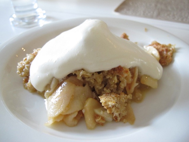 Fullt med inhemska äpplen i en uunikokki, sedan havregryn, socker, margarin och grädde till en röra som läggs på som ett skal över äpplen. Inget jag skulle servera på dagis dock, på grund av sockermängden. Jo, jag kör nog verkligen med samma princip som du gällande ätandet!