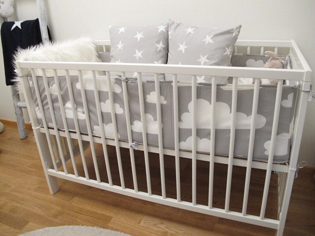 Spjälskydd till sängen. Bebben kommer dock den första tiden att sova i mammalådan. Det finns redan ett tyg till den men jag har ändå funderat på att sy ett nytt under min långa mammaledighet. Vi får se.