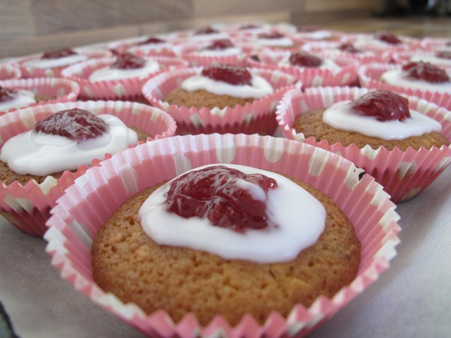 Och det där med hur man gör då? Blanda ägg och socker rätt poröst. Blanda skilt alla torra ingredienser. Häll i dem i ägg och socker blandningen. Häll i det smultna margarinet (inte Rainbow). Blanda bra. Klicka i muffinsformar. Kasta in i ugnen. Ät lite smet och var glad. Medan tårtorna svalnar fixa till lite glasyr (dubbelsats lönar sig). Sedan sylt i mitten och glasyr runt. Jag vet att ni kan.