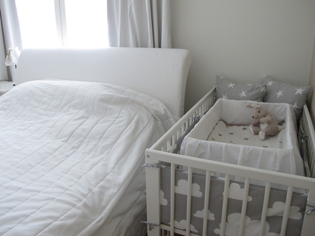Har beundrat tyget med molnen på redan tidigare o sökte mig tillbaka hit.. Är spjälsängsskyddet köpt eller har du sytt det själv? Var har du isf hittat tyget? O har du själv sytt tyget du har runt moderskapsförpackningen? Riktigt mysigt ser det ut!:)