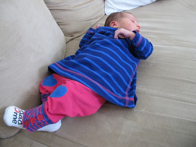 I dag var det dags att prova en klänning på Minni. Jag blev alldeles ledsen av det hela. Hon blev alldeles för stor alldeles för snabbt. Så klänningen hade vi på henne i fem minuter och är nu tillbaka till body och byxor. Nu är hon vår bebuli igen.