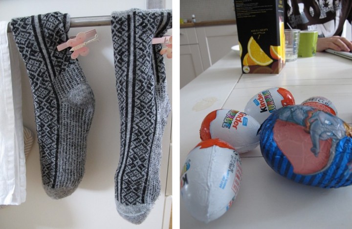 Vi har lite olika traditioner här hos oss. Sockorna på plats men för mannen i huset var det påskharen som hade skött chokon och för mig var det påskhäxan som flugit in under natten med chokon. Resultatet var i alla fall det samma för oss båda. Chokoägg till morgonmål.