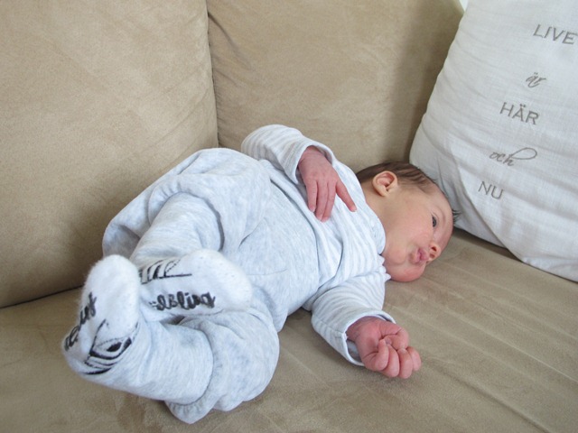 Flickan som imorgon blir sex veckor gammal väger nu 4680g och är 57,5 cm lång. Tänka sig att hon väger en hel mjölkburk mera och är över 6 cm längre än när hon föddes. Inte så konstigt att jag tycker att hon förändras för varje dag som går. Hon är en glad flicka vår Minea. Hon ler, umgås supergärna, har ljud för sig och har börjat gurgla smått. Hon äter allt som oftast med tre timmars mellanrum men det första sovpasset på natten kan vara i fyra-sex timmar. Hon är konstigt medgörlig. Gillar famnen, gillar vagnen, gillar manducan, gillar sittern, gillar bilstolen, gillar nappen, gillar läget helt enkelt.