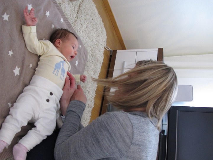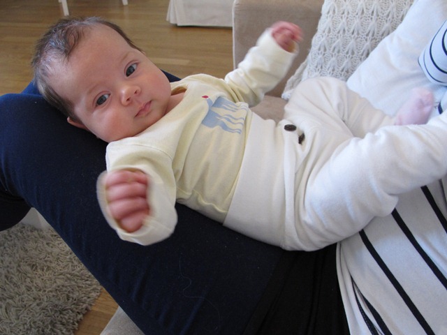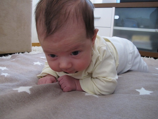 Den dagliga träningen på mage. Eller ja, mage och mage. Det går inte så länge innan hon lagt sig på rygg.