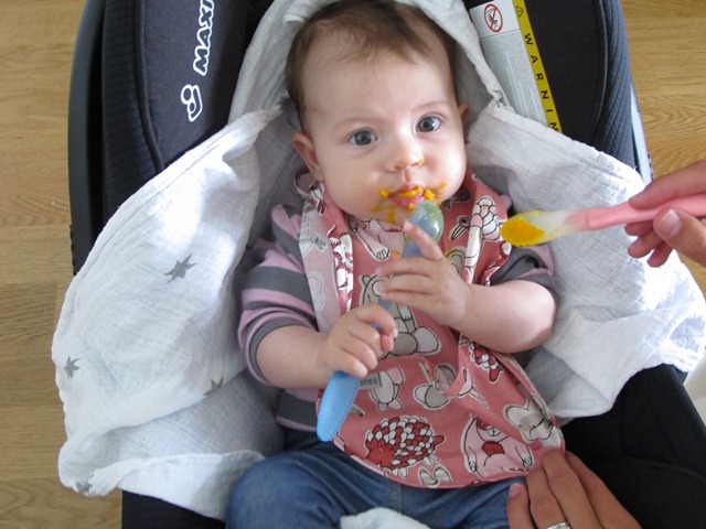 Det funkar helt bra. Nu har det gått sex dagar och efter fyra dagar med enbart morot har vi i förrgår och igår givit morot-potatisblandning. Magen tycker det är ok. Välling däremot. Hohho. Hon bara spyr upp allt, så jag vet inte riktigt om vi ska satsa på det eller inte. Har ni redan börjat med fast föda?