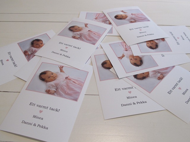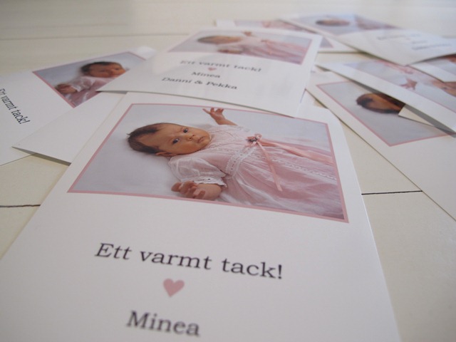 Såhär tackade vi släkt och vänner efter Mineas dop. Ett stort tack till Malin för hjälp med fotografering och design.