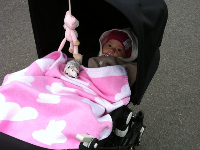Det var såklart inte alltför lätt första gången hon skulle sova i sin sittdel. Men jag tror det är övergående för nu sover hon ute redan för andra gången idag. Snart drar vi mot stan.