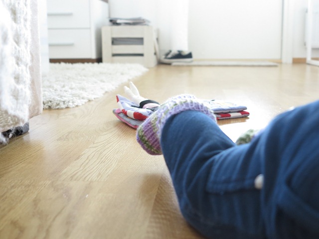 Ja. Nu vill man verkligen ha yllesockor på sig här inne. Klart att jag tänkte att Minea också skulle ha varma fötter trots kallt golv. Så hon fick yllesockor. De hölls på i kanske tio minuter. För vi har ett problem i detta hushåll. Ett strumpproblem.