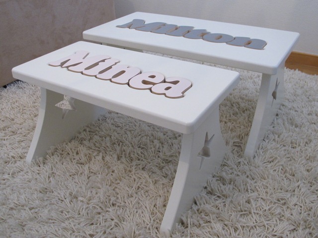 Och en liten jämförelse. Mineas lite mindre pall och Miltons lite större. Melwin har en likadan som Milton. Den ska man ha om man har fler bokstäver än fem. Och eftersom ni frågat mig trettiofem gånger var man får tag på dessa pusselpallar ska vi ta det igen. Bonde of Sweden är stället.