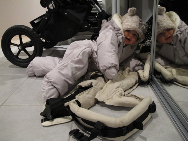 Ibland får man göra det lite lättare för sig. I stället för att efter promenaden rulla in vagnen med ungefär halva byns sand i hallen kan man ju bara köra med bärsele och slippa plocka fram dammsugaren ett extra varv.