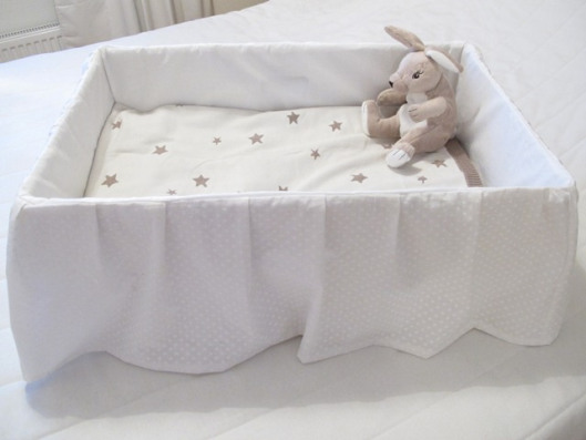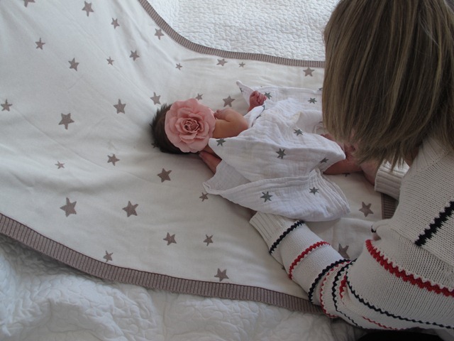 Sydde ett stjärntyg till mammalådan. Lådan kom att bli Litens första säng.
