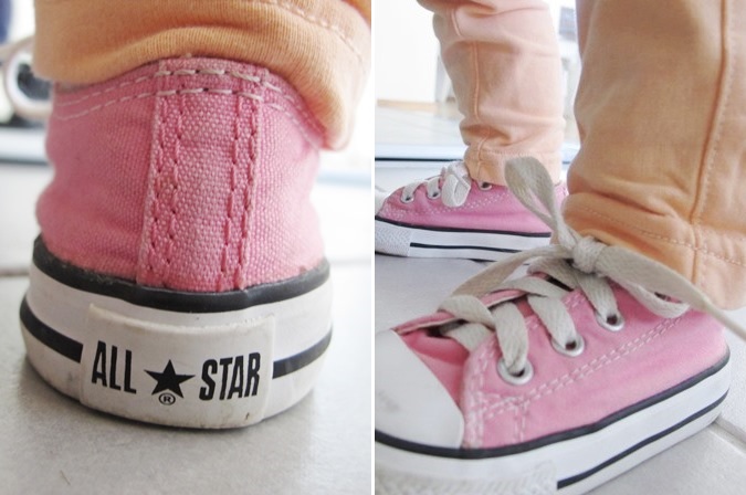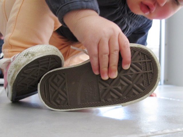 Svårt att veta såklart. Minea har den minsta storleken som finns av ”riktiga skor” (inte babytossorna) som är 21. På storlekslappen står det att de är 12,5 cm. Hoppas att de passar henne i sommar för nu är de alltför stora. Vet inte hur lång fot Minea har just nu.