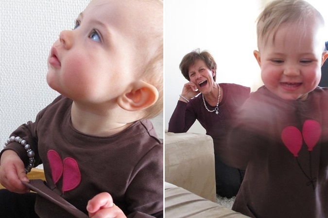 Minea tycker det är festligt med besök. Inte minst när det är mommo som är här. Då blir hon så glad att hon klappar, springer, kryper, skrattar och blir allmänt sprallig. Hon blir svår att fånga på bild. Men när hon får låna mommos armband, då är det lugnt och fint.