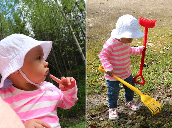 Minea åkte lite plastomoppe, men upplevde väl det lite för trist så hon satsade på lite famn, lite gårdsarbete och eget tultande istället. Och detaljen som gjorde denna dag extra somrig var nog hennes nya t-shirt. Hur pigg?