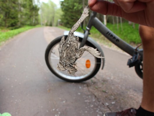 Den här platta och kruttorra grodan var ett av cykelutfärdens snyggaste fynd. Jag var alldeles begeistrad över den när jag promenerade med barnvagnen en stund tidigare. Fick också de andra övertalade om att det här var häftigt.