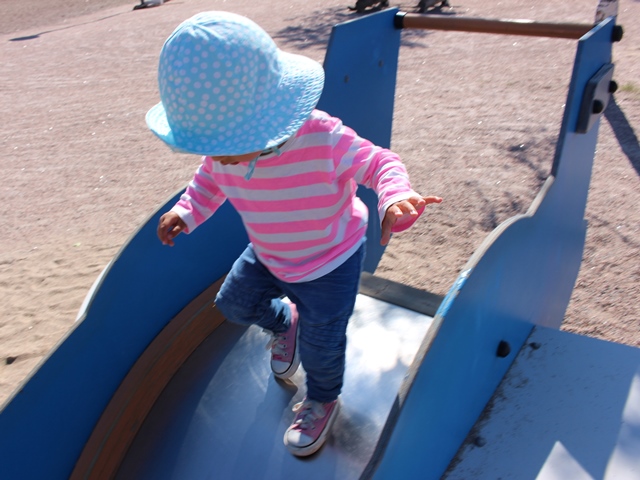 Det är rätt sällan ni får se bilder på Minea åka rutschkanana. Här ser ni orsaken. Idag gjorde jag misstaget att plocka fram kameran innan hon satt sig. Som ni ser sätter hon sig inte. Här sprang hon ner och ramlade.