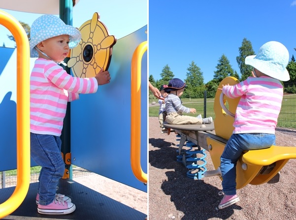 Inte heller alls säkra situationer att fotografera. På höga höjder styr hon skeppet. Och när Melwin sätter igång och gungar på fågelgungan vet man inte hur långt de mindre kidsen flyger. Men här gick det bra idag.