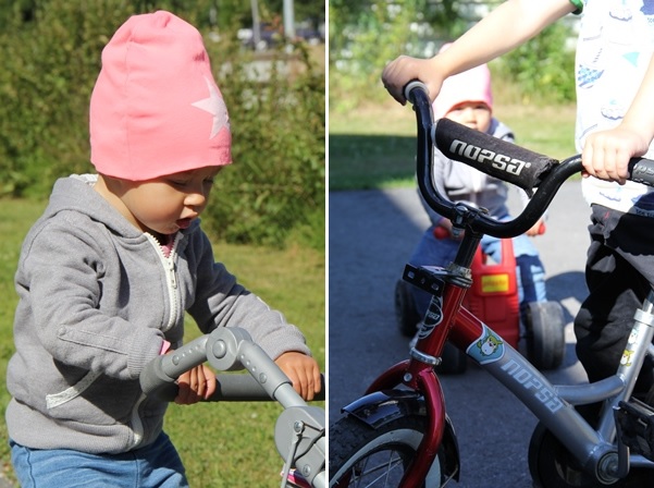 Ett besök hos Sagoborgsgänget såhär på förmiddagen. Och Minnis små öron i säkert skydd från den hårda blåsten. Nu kommer väl den lilla flickan att få ha mössa resten av sommaren.
