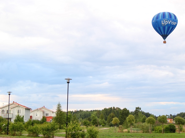 Plötsligt såg jag P springa ut. Och så var jag tätt i hans hälar. En varmluftsballong restes på vår gräsplan enstaka meter från dörren. Och så hann vi se lite förberedelser innan de lyfte och vi vinkade av folket som skulle få åka på äventyr.