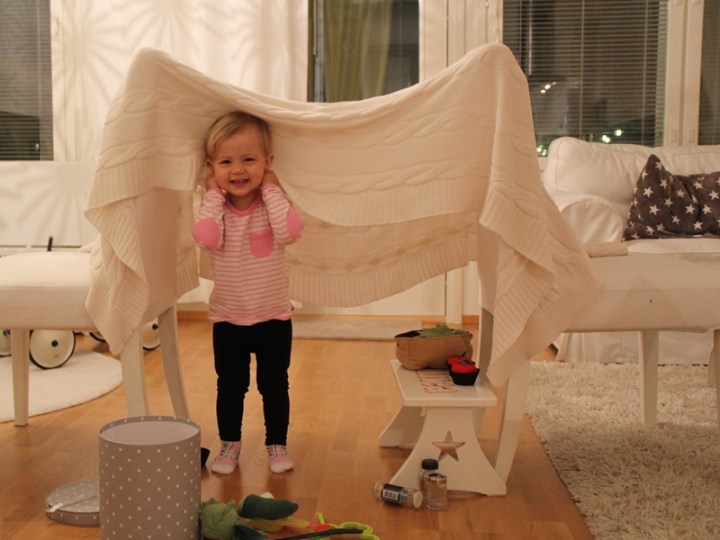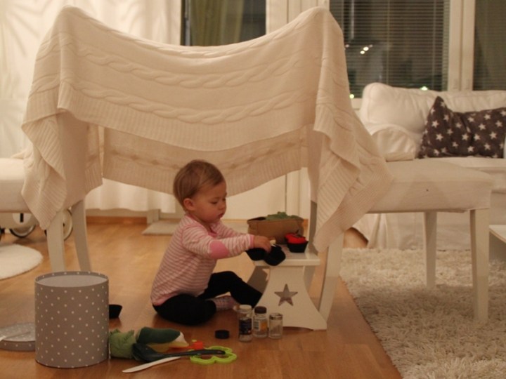 Imorse blev det två stolar och en filt som omedelbart blev ett kök. Lite tittut hann hon också med mellan varven.
