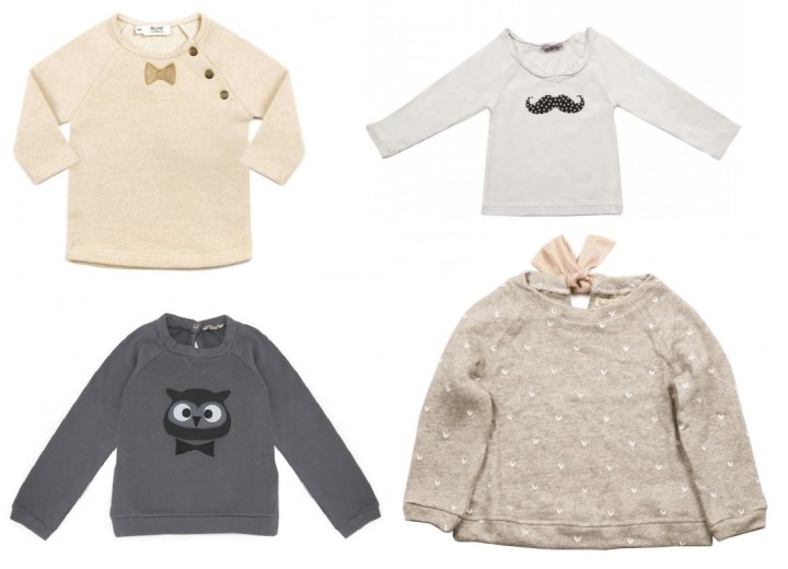 Baby sweatshirt – Smart (Blune Paris) , Baby t-shirt – Moustache (Emile et Ida), Dark grey sweatshirt – Owl (Emile et Ida), Girl’s sweatshirt – Hearts (Louise Misha).