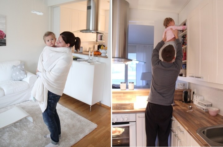 Här får jag en liten stund ha Minea under filten och så hjälper Minea pappa med att lägga tillbaka kakaon på översta hyllan när vi bakat klart.