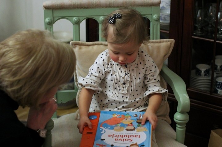 Och på eftermiddagen i en annan. Och då fick Minea ett par klappar till. Så lycklig över sin nya sångbok med finska barnsånger.