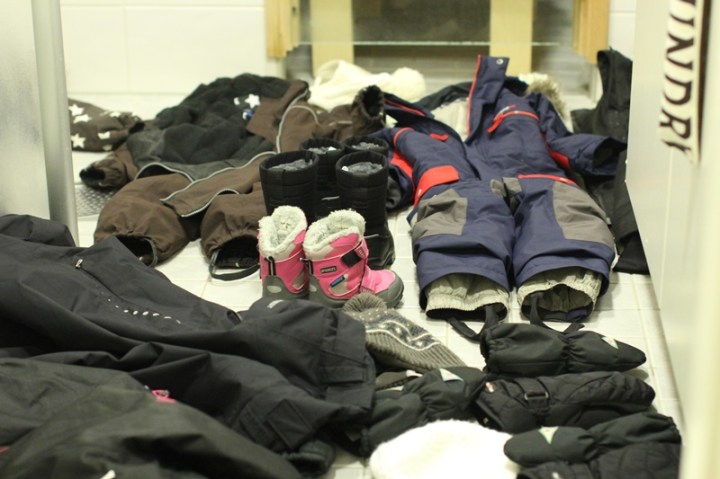 Och visst var badrummet fullt med våta plagg efter denna utetimme. Men på rätt sätt våta denna gång. Av snö, inte av regn. Vinter!