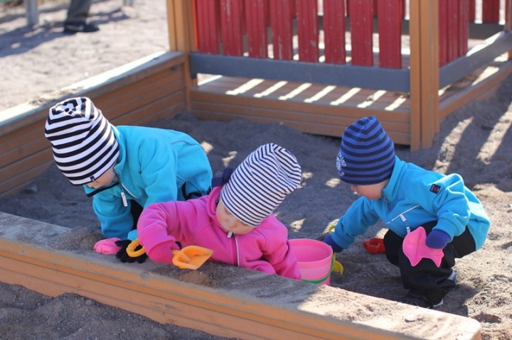På morgonen behövdes ännu diverse utekläder. Minea trivdes med kusinerna och man hade eventuellt kunnat tro att patrasket var sponsrat av Polarn o. Pyret.