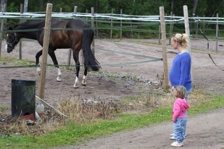Det viktigaste när vi åker bil är att se alla hästar längs vägarna. Så idag tog vi tag i saken och kollade in hästarna lite närmare. Tack vare mina hästägare till vänner är det inget stort projekt. Minns så bra förra gången vi besökte Danis häst. Det var roligt och spännande att kolla så länge den lilla inte behövde röra eller vara allt för nära djuret. Och en rätt likadan upplevelse blev det idag när vi hade med oss Ammi till stallet. Dani red och grejade med hästarna medan vi tre, Ammi, Minea och jag, fick vara åskådare.