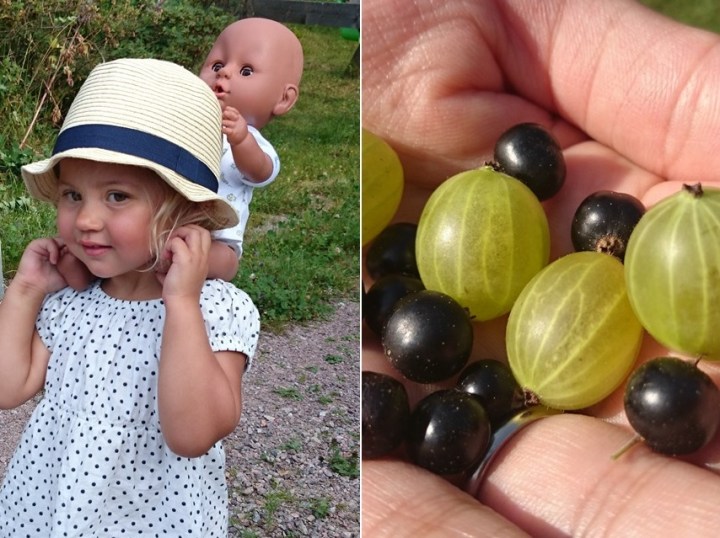 Det som skulle vara en snabb ”Hej vi hämtar hem vårt barn”-grej, blev plötsligt en heldagsgrej. Och jag har egentligen bara satt fokus vid existens. Att försöka överleva i värmen. Och så har jag ätit svarta vinbär för kung och fosterland. För några dagar sedan läste Pekka högt för mig att gravida och ammande kvinnor ska äta svarta vinbär för att bebben ska ha mindre risk för atopisk hud. Haha, så tokigt att man ska läsa något och känner att man genast ska göra så. Men eftersom Minea har väldigt torr hud så kan det ju vara bra att satsa på de där vinbären nu då. Haha.