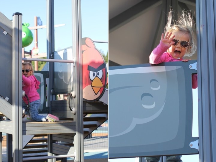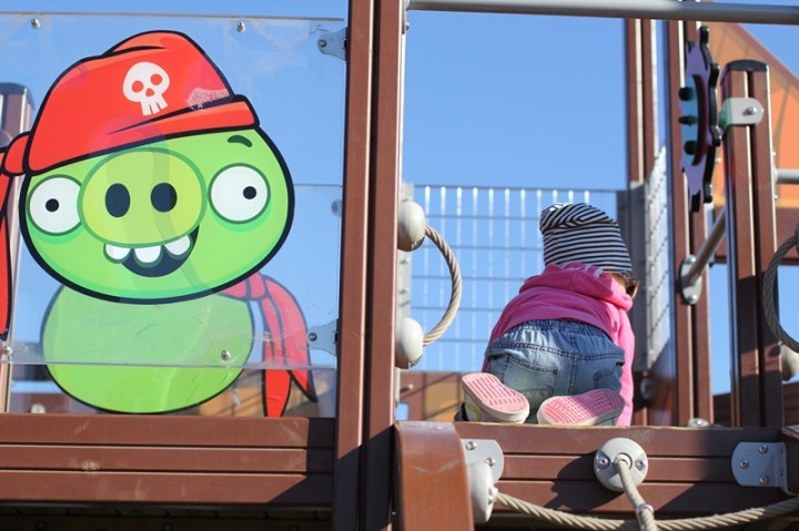 Jag tyckte att Minea och jag behövde något roligt program att göra på tumis. Den senaste tiden har handlat mycket om att pappan i huset tagit med Minea till diverse funfun grejer medan jag vilat. Så idag tog jag risken på fisken och åkte till de Angry Birds-parken i Oitans. Jag vet ju att jag inte kan klättra med henne och jag hade faktiskt ingen koll på hur hon utvecklats sedan jag varit där med henne senast.