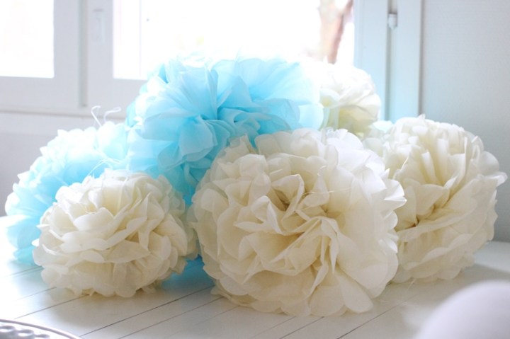 Så ligger ett hav av pom poms på matbordet och väntar på dopfesten. Ja, jag har outsourceat all bakning så här befinner jag mig plötsligt i en ny sits och kan tänka på dekorationer.