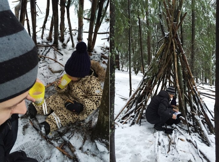 Kakao i termosen och termosen i ryggsäcken. Leo i bärselen och alla in i vattentäta kläder. Iget vidare väder men skogsutfärd blev det denna första februaridag. Kojan som ligger nära till hands är alltid en favorit och ett perfekt ställe för kakaopaus.