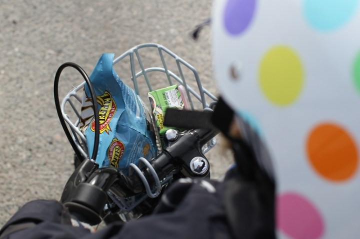 Skött fredagsrundan som vanligt. Bibban, posten och idag butiken som bonus. Skaffade fram lite material för fredagsmys. Så där rullade hon fram med korgen full med fredagsmys. Mycket stolt.