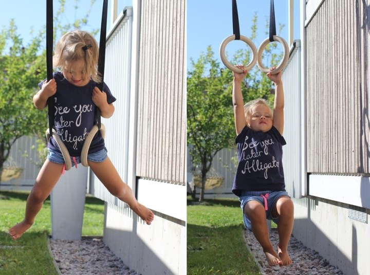 De här gymnastikringarna är nog det roligaste Minea har på gården nu. Ja, de och hängmattan såklart, som hon tror att är en gunga för hååård fart.