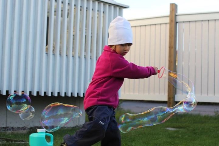 Det ser ut som såpbubbelväder, det är nästan sommar!, förklarade Minea med stora glada ögon för oss. Visst, visst och ut med bubblorna. Alla burkar.