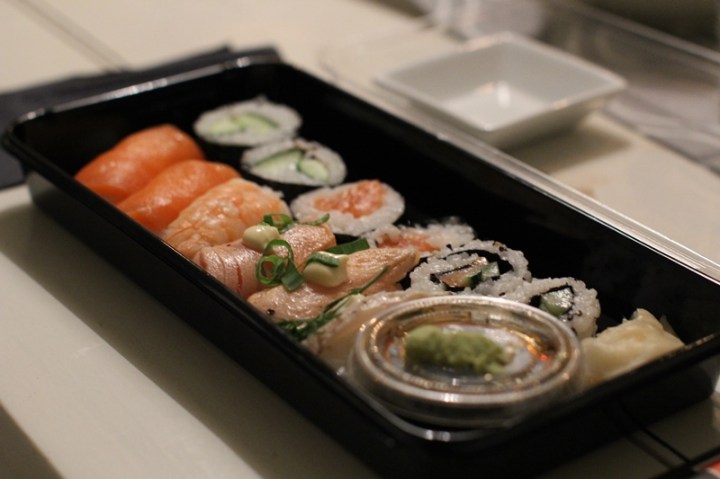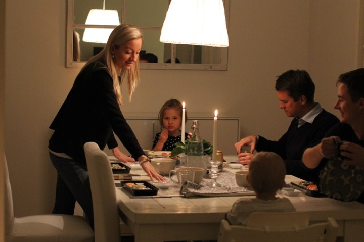 Det såg lite annorlunda ut för ett år sedan på vår sushikväll med Lotti och Anttu. Då var det en ständig risk att fälla en sushibit med soja på Leo som låg i famnen medan vi åt. Nu satt han där och åt sushiris och Minea smällde i sig en hel del sushi hon också.