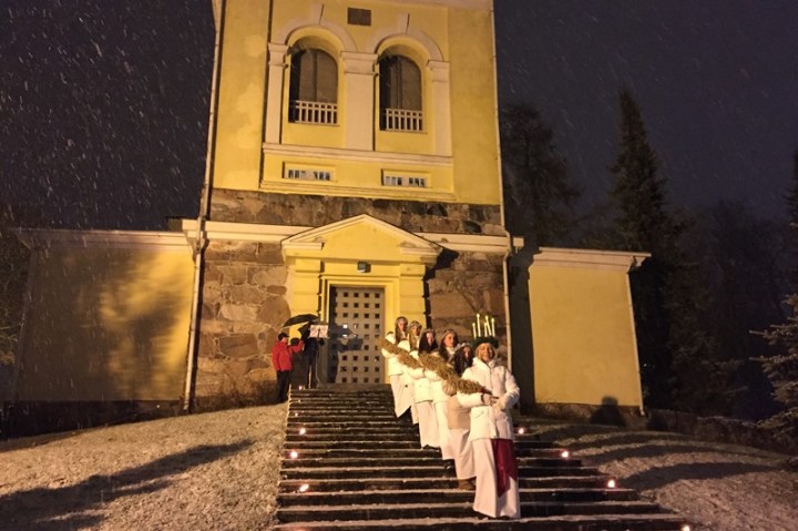 Idag fick vi middagsgäster och tillsammans tog vi oss sedan till Kyrkslätt för att se vår egen Lucia skrida ner för kyrktrappan. Härligt med snö på marken dagen till ära. Så stämningsfullt.