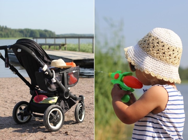 Packade packåsnan full av strandgrejs och skjutsade min dotter ner till stranden. När hon hörde att vi skulle ta nya vagnen skulle cykeln absolut inte med. Det viktigaste att få med var vattenpistolen. Hon tog också några simtag där på privatstranden. På morgonen får vi ofta ha hela stället för oss själva vilket passar en valross och en sprallis riktigt bra.