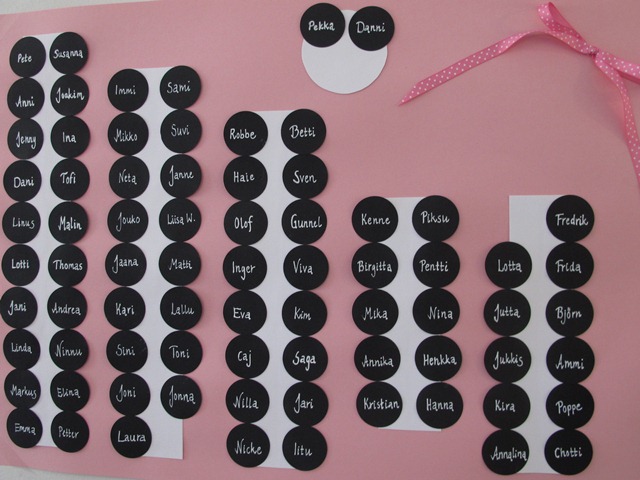I hopp om att efterlikna stenarna fixade jag liknande cirklar av svart kartong och skrev namnen med vit penna. Sittordningen fastställdes och limmades upp dagen före bröllopet.