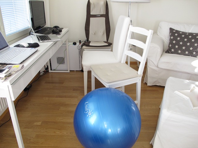 Det är ju i alla fall bra att ha valmöjligheter när man sitter och knäpper vid datorn. Massagestol (inte för mig), skön stol, hård stol, fotölj eller kanske en pilatesboll. Just nu kör jag med den sistnämnda.