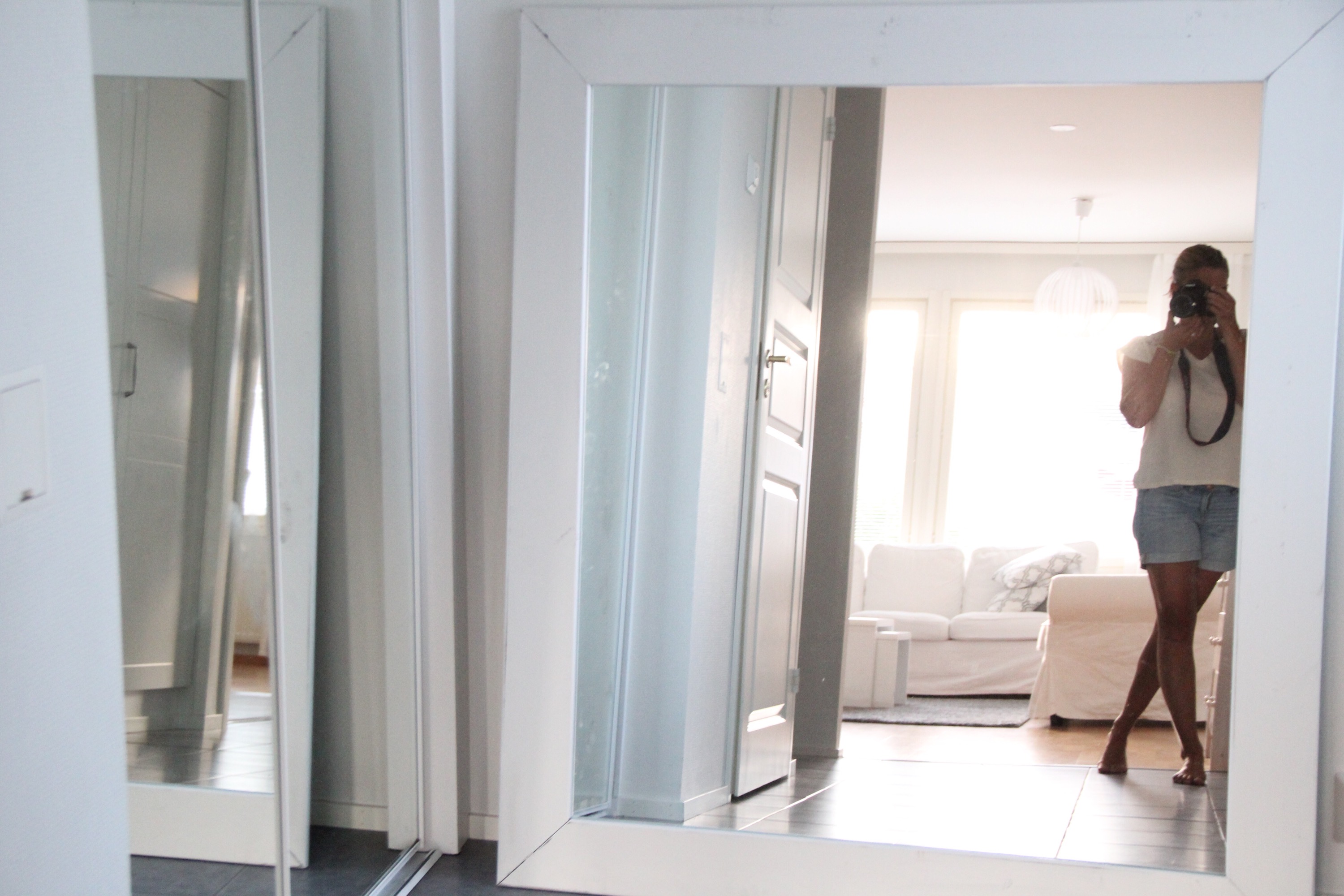 Ah. Där står den måttbeställda spegeln nu i hallen och väntar på upphängning. Jag är givetvis skitskraj att vi ska smälla sönder den här under dagen när den står där på golvet. Det är inte precis lugnt tempo här för tillfället.