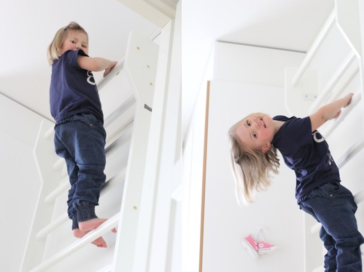 Ni som följer mig på instagram såg redan igår att något nytt och mycket roligt flyttat in i Mineas rum. En ribbstol nämligen. Medan Toni på Dinox och jag smed planer om vilken ribbstol som skulle vara den rätta hemma hos oss höll jag helt tyst. Först när vi förra måndagen fick spurta till huset för att ta emot det enorma paketet måste jag berätta för Minea vad det fanns i paketet. En ivrigare flicka har man fått leta efter. I en vecka har hon gått och väntat på att ribbstolen skulle monteras på väggen. Igår hände det då och lyckan var gjord.