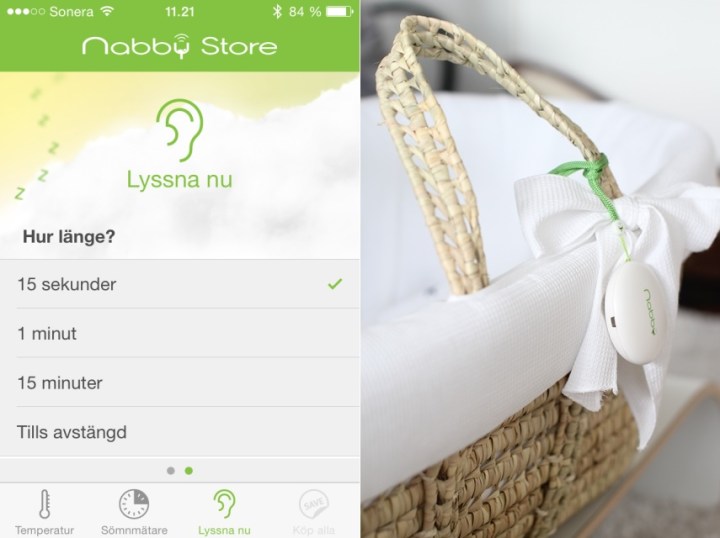 Men resten. Helt superbt. Till iPhone och Android tas alltså en Nabby app ner och det är bara att döpa sin Nabby och börja på. I gratisversionen fungerar Nabbyn som en vanlig babyvakt. Genom att betala 0,89€ blir alla funktioner tillgängliga. Det finns temperaturmätare, sömnmätare och lyssna nu. Inte helt nödvändiga men ack så roliga tillägg. Det bästa är att bara din egen babys ljud hörs. Och helt klart hörs det också. Har det varit tyst för länge är det bara att trycka på lyssna nu-örat så får du höra vad som händer i vagnen. Temperaturen är ju bra att följa med faktiskt, speciellt med den lillalilla bebisen. Och så har vi sömnmätaren som för statistik över barnets sömn. Ganska bra när den tankspridda mamman på kvällen undrar om barnet sovit eller inte sovit idag. Eller var det igår han sov en lång vila? Ja sådant.