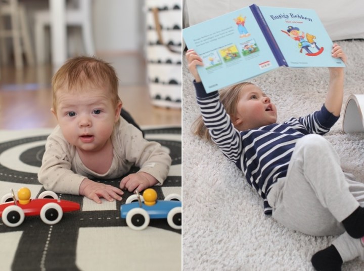 Och vid en av de lugna stunderna idag såg det ut såhär. Lejonungen med sitt begynnande bilintresse och loppan med sitt läsintresse.